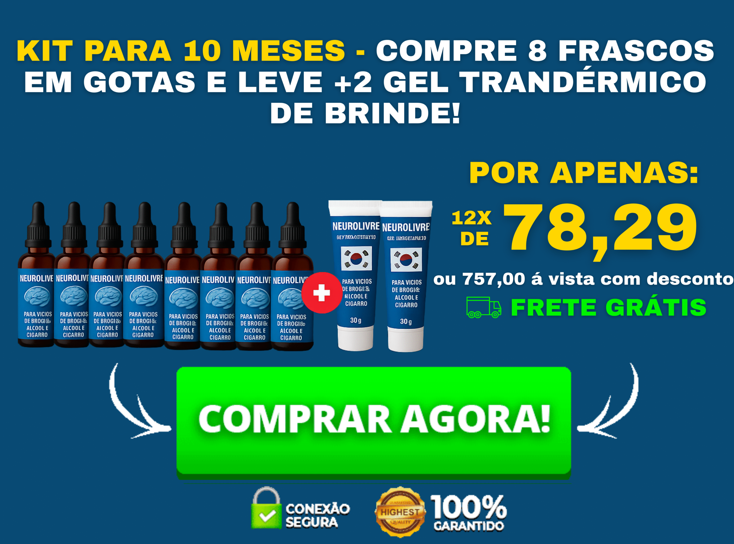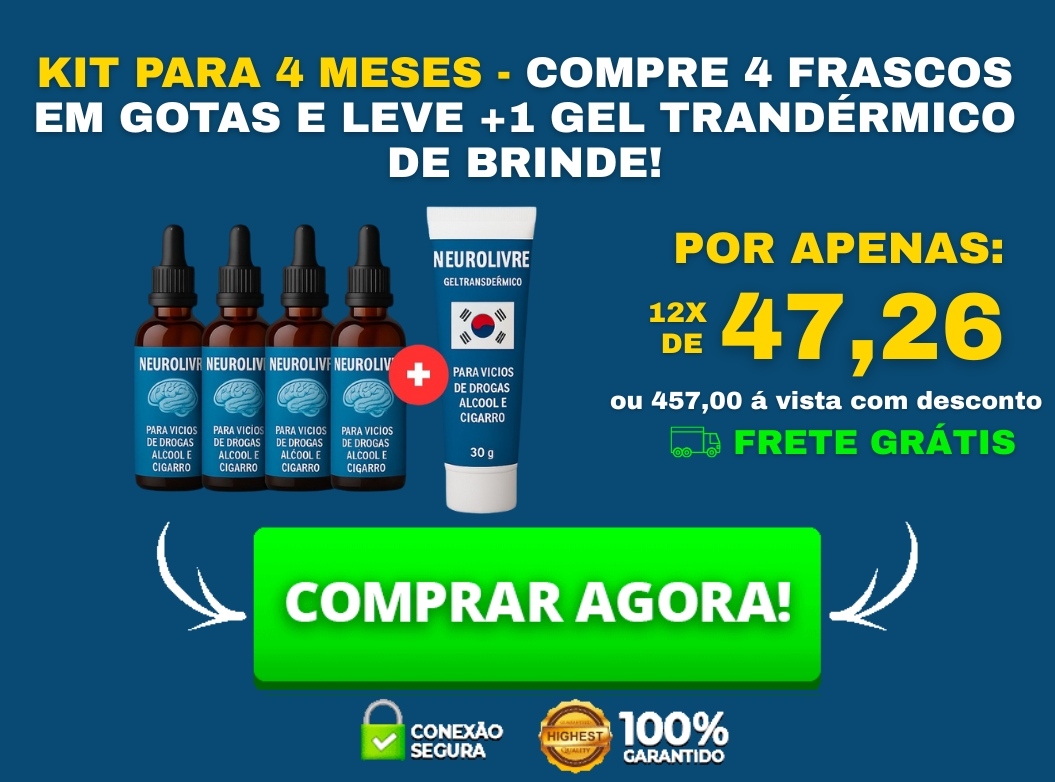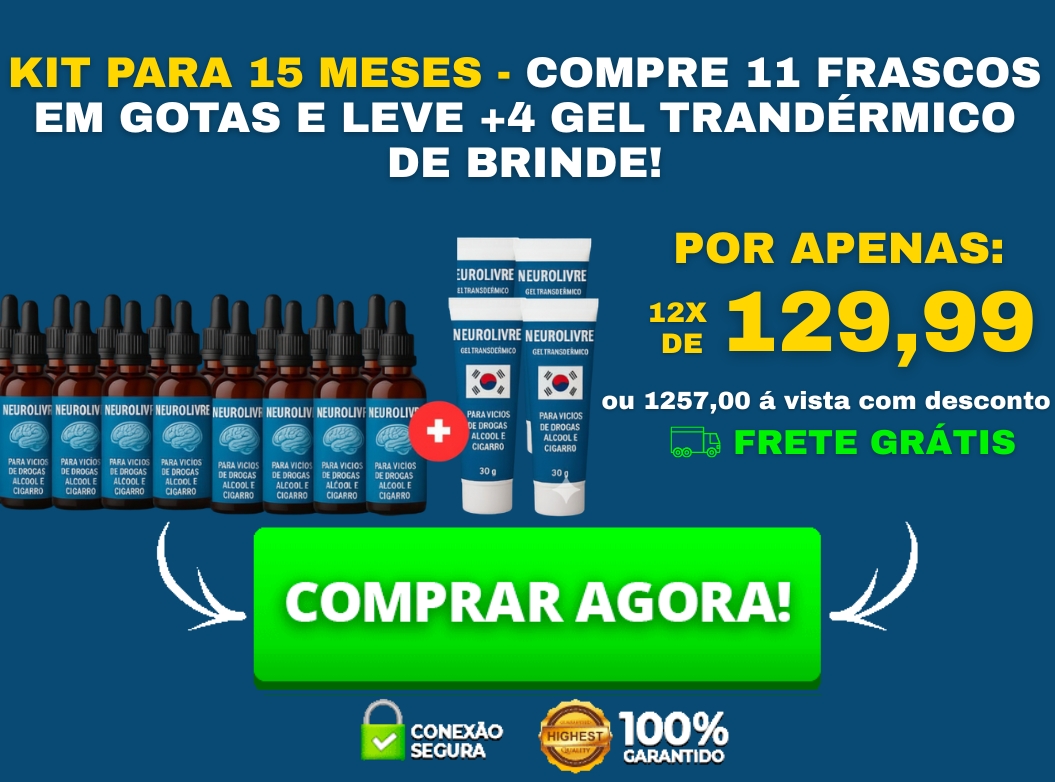 "A combinação exclusiva das gotas Neurolivre com o Gel Transdérmico Coreano apresentou resultados rápidos em nossos testes. Este tratamento é a solução ideal para quem luta contra vícios de álcool, drogas ou cigarro. Reduz a fissura, controla a ansiedade e traz alívio emocional duradouro. Experimente o Neurolivre e recupere sua liberdade e qualidade de vida."